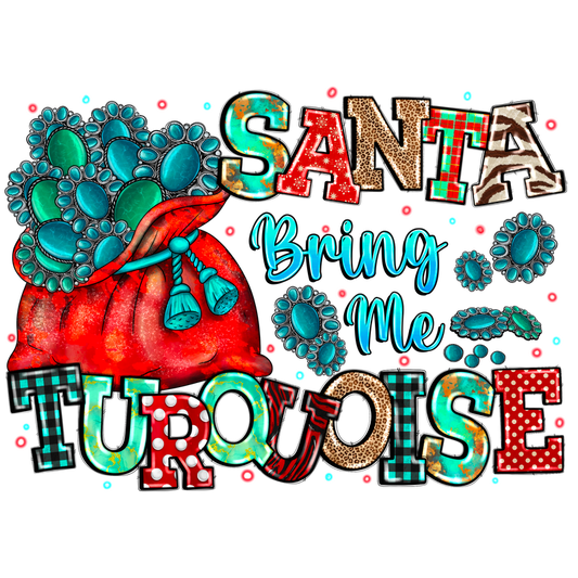 Fun and festive design featuring the phrase "Santa Bring Me Turquoise," adorned with colorful letters and charming turquoise elements!DTF Transfers heat press transfers heat press transfers