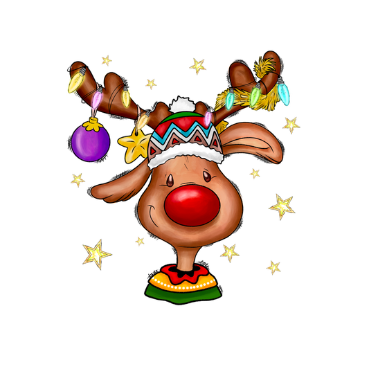 A cheerful cartoon reindeer adorned with festive decorations, wearing a colorful sweater and a fun winter hat, perfect for the holidays!DTF Transfers heat press transfers