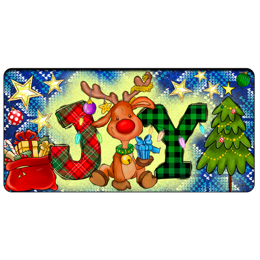 A cheerful holiday scene featuring a cute reindeer, colorful letters spelling "JOY," gifts, and a decorated Christmas tree.DTF Transfers dtf prints