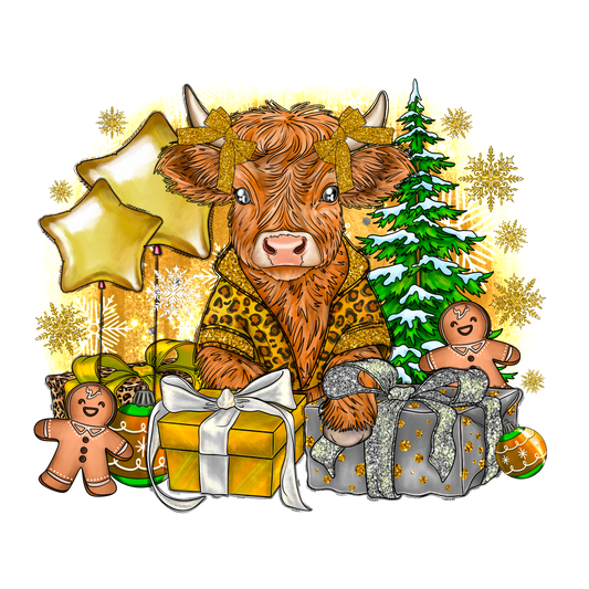 A charming illustration of a festive cow in a stylish robe surrounded by wrapped gifts, gingerbread cookies, and holiday decorations.DTF Transfers dtf transfers dtf prints