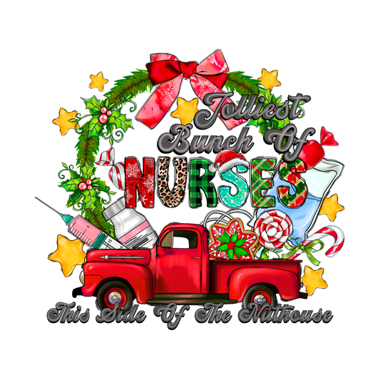 A festive design featuring a charming red truck surrounded by holiday elements, celebrating nurses with the words "Jolliest Bunch Of Nurses."DTF Transfers dtf prints