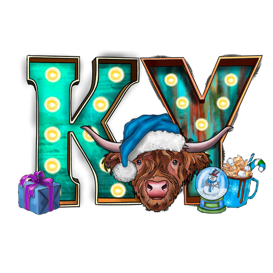 A festive illustration featuring a Highland cow wearing a blue Santa hat, surrounded by decorative letters "KY," gifts, and holiday treats.DTF Transfers dtf prints