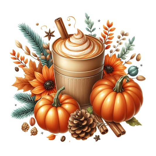 A cozy autumn-inspired illustration featuring a pumpkin spice drink, surrounded by pumpkins, sunflowers, and vibrant fall foliage. dtf transfers