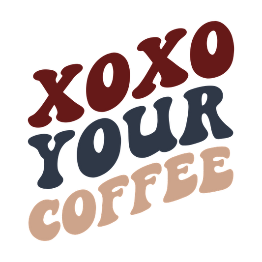 A playful graphic featuring the text "xoxo your coffee" in vibrant, stylish fonts and colors. heat press transfers