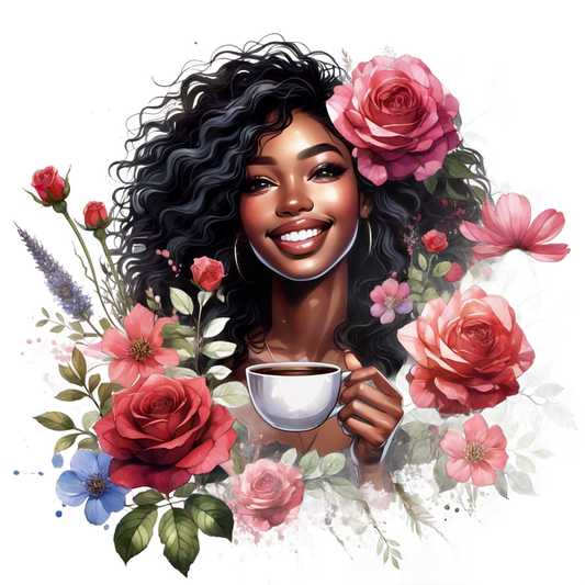 Regular price From £0.75 GBPRegular priceUnit price / per£2.39 GBPSale price From £0.75 GBPA joyful woman with curly hair holds a white coffee cup surrounded by vibrant flowers, radiating warmth and positivity.dtf regular iron