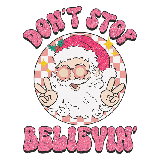 A cheerful Santa with glasses gives a peace sign, adorned with festive pink glitter text reading "DON'T STOP BELIEVIN'." heat press transfers