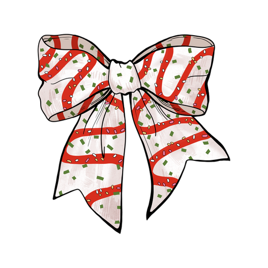 A festive red and white bow adorned with green accents, perfect for holiday decorations or gift wrapping. dtf transfers