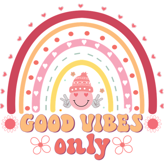 A cheerful graphic featuring a colorful rainbow, smiling character, and the uplifting phrase "Good Vibes Only."dtf regular iron