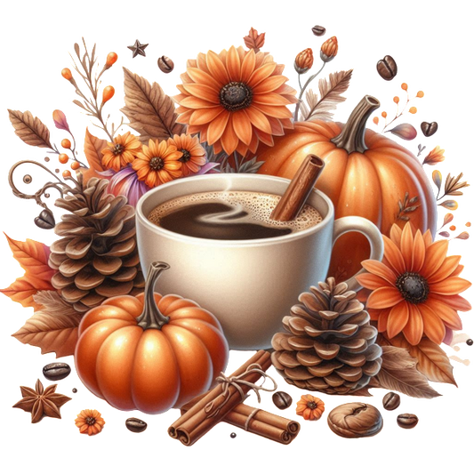 Regular price From £0.75 GBPRegular priceUnit price / per£2.39 GBPSale price From £0.75 GBPA cozy autumn scene featuring a cup of coffee surrounded by pumpkins, sunflowers, pinecones, and cinnamon sticks.dtf regular iron