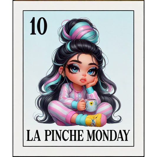 A cute illustration of a girl in pajamas, sipping tea, with colorful hair, and the text "La Pinche Monday." heat press transfers