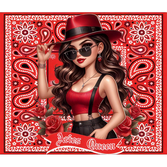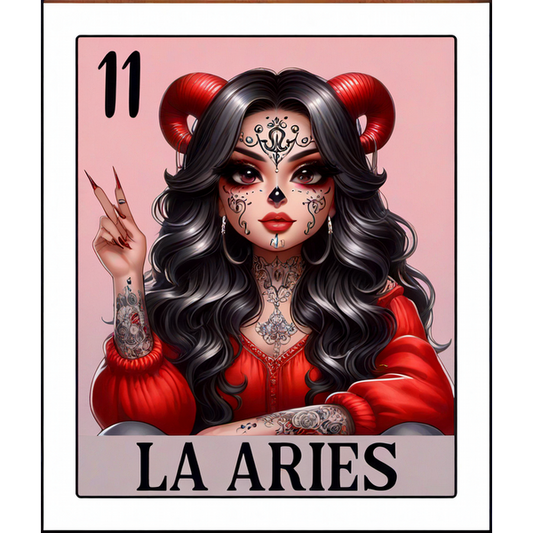 Regular price From £0.75 GBPRegular priceUnit price / per£2.39 GBPSale price From £0.75 GBPA bold illustration of a tattooed woman with ram horns, wearing a red top, representing the Aries zodiac sign. dtf prints