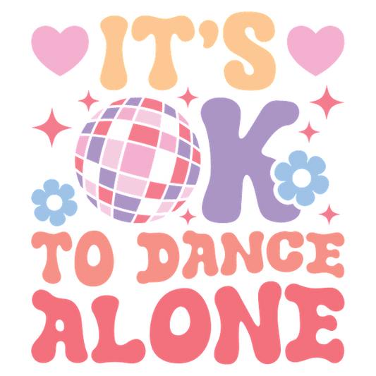 A colorful and playful graphic featuring a disco ball with the cheerful message, "It's OK to dance alone." dtf prints