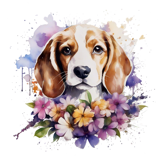 A charming watercolor illustration of a beagle surrounded by colorful flowers, showcasing its expressive eyes and playful nature. dtf transfers