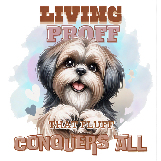 A charming illustration of a fluffy dog, showcasing the playful slogan "Living Proof That Fluff Conquers All."dtf regular iron