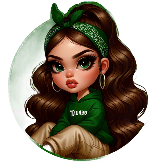 Regular price From £0.75 GBPRegular priceUnit price / per£2.39 GBPSale price From £0.75 GBPA cute, animated girl with long, wavy hair wearing a green hoodie and bandana, featuring big expressive eyes. dtf transfers