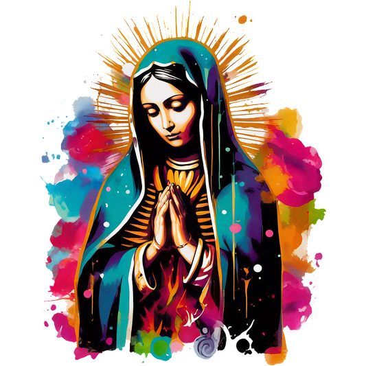 A vibrant and colorful illustration of a praying figure, adorned in a blue mantle with a radiant halo. dtf transfers