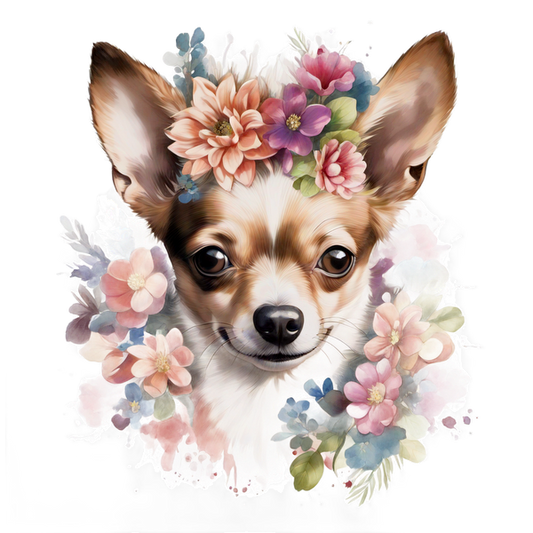 Regular price From £0.75 GBPRegular priceUnit price / per£2.39 GBPSale price From £0.75 GBPA cute Chihuahua adorned with a vibrant floral crown, showcasing a playful smile surrounded by colorful flowers.dtf regular iron