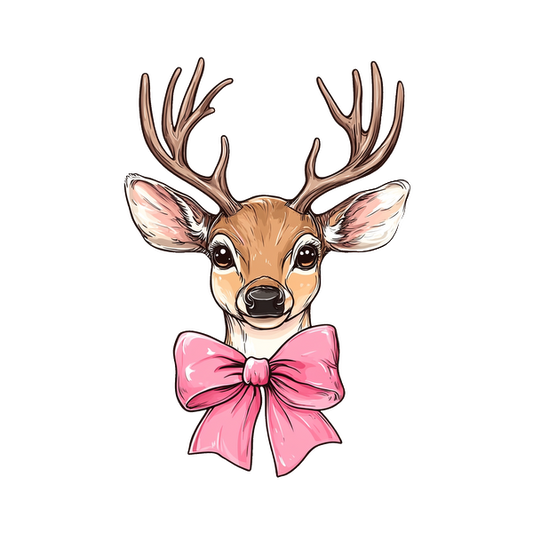 A charming illustration of a deer with antlers, adorned with a cute pink bow, capturing a playful and whimsical vibe.dtf regular iron