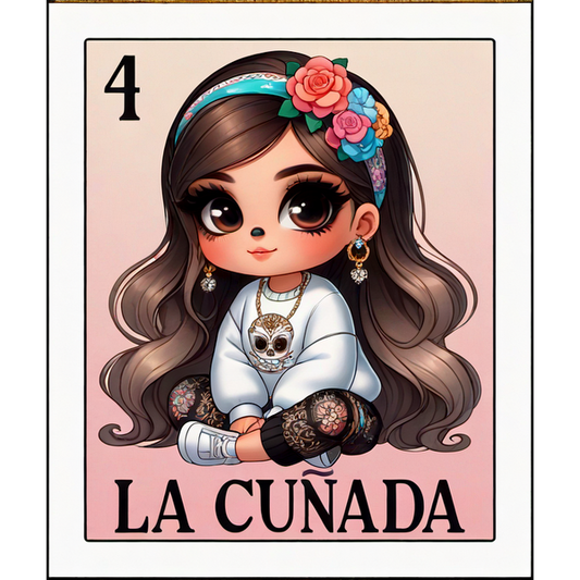 A cute cartoon character with long, wavy hair, wearing a floral headband and a stylish outfit, titled "La Cuñada." dtf transfers