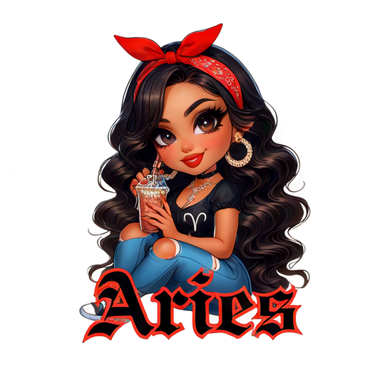 Regular price From £0.75 GBPRegular priceUnit price / per£2.39 GBPSale price From £0.75 GBPA stylish cartoon character representing Aries, featuring long dark hair, a red bandana, and holding a drink, wearing a casual outfit.dtf regular iron