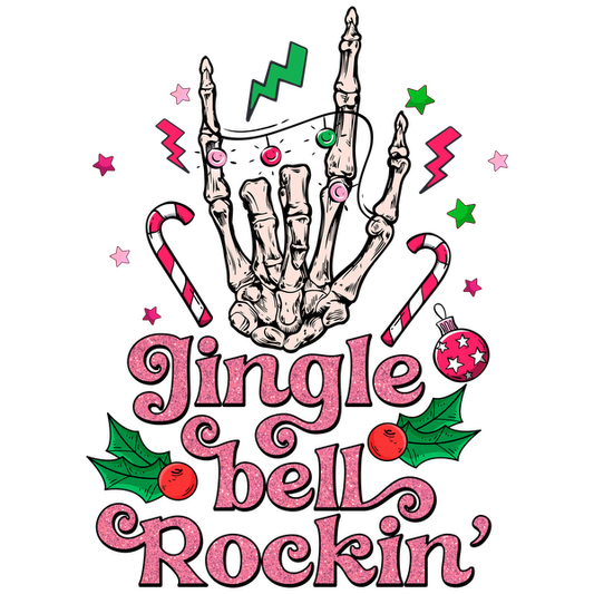 A festive design featuring a skeleton hand with holiday elements and the playful text "Jingle Bell Rockin’."dtf regular iron