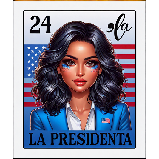 Regular price From £0.75 GBPRegular priceUnit price / per£2.39 GBPSale price From £0.75 GBPA vibrant illustration featuring a confident woman in a blue suit with an American flag backdrop, labeled "La Presidenta." dtf prints