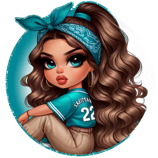This vibrant illustration features a stylish character in a blue jersey with a playful bandana and voluminous curls.