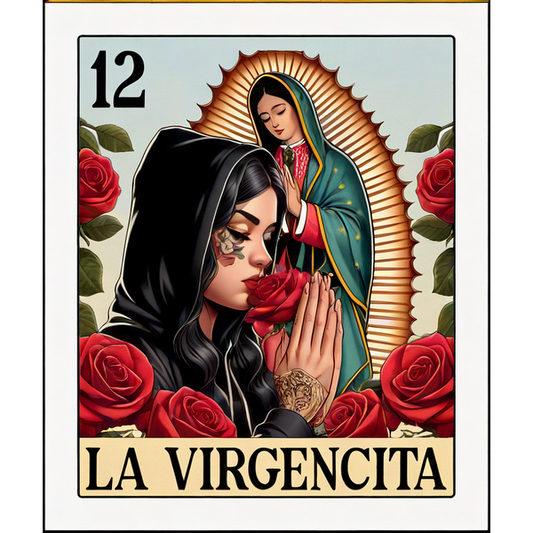 Regular price From £0.75 GBPRegular priceUnit price / per£2.39 GBPSale price From £0.75 GBPA vibrant illustration featuring a woman in a black hoodie, roses, and the Virgen de Guadalupe, labeled "La Virgencita." dtf prints