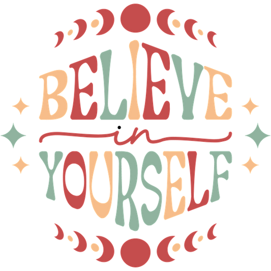 A colorful motivational graphic featuring the phrase "Believe in Yourself" surrounded by whimsical elements and vibrant colors. heat press transfers