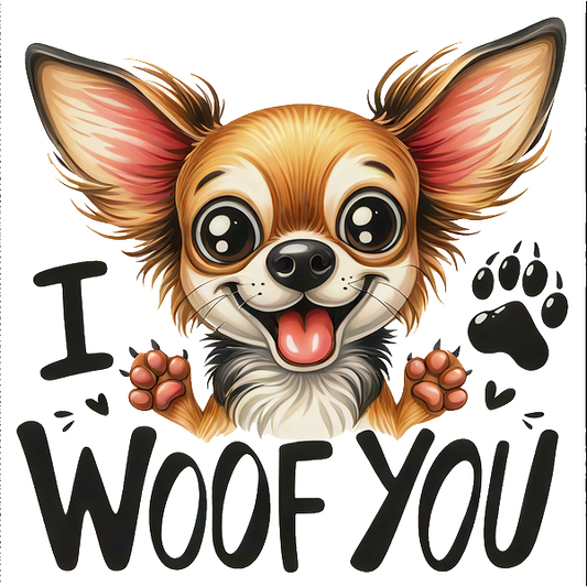 A cute cartoon Chihuahua with big eyes and a cheerful expression, accompanied by the text "I WOOF YOU." dtf transfers