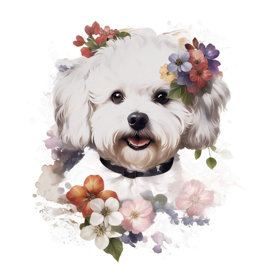 A charming white dog adorned with colorful flowers and a joyful expression, surrounded by a watercolor floral background. heat press transfers