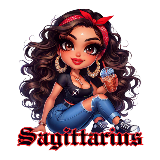 Regular price From £0.75 GBPRegular priceUnit price / per£2.39 GBPSale price From £0.75 GBPA stylish Sagittarius character with long curly hair, wearing a black top and distressed jeans, holding a drink.dtf regular iron