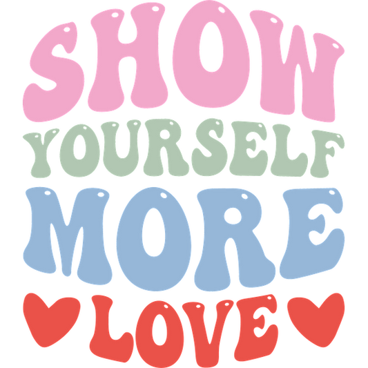 A colorful and playful design with the phrase "Show Yourself More Love" in bold, whimsical letters. dtf transfers