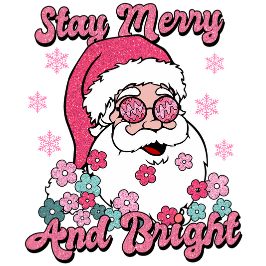 A cheerful Santa with vibrant glasses surrounded by colorful flowers, adorned with the festive text "Stay Merry And Bright."dtf regular iron dtf prints