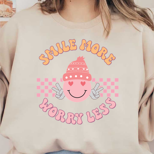 A cheerful graphic design featuring a smiling pink face in a hat, encouraging positivity with the phrase "Smile More, Worry Less." heat press transfers