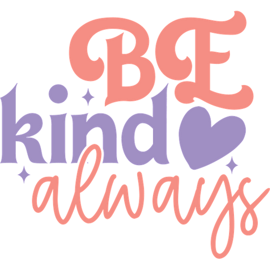 A colorful and cheerful graphic with the inspiring message "Be Kind Always," featuring playful fonts and heart designs.dtf regular iron