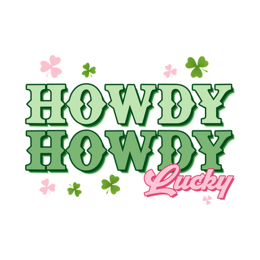 A playful "Howdy" design with vibrant green text and pink accents, surrounded by cheerful shamrocks for a lucky vibe. heat press transfers