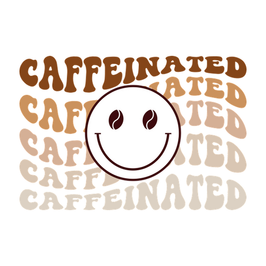 A fun and cheerful design featuring the word "Caffeinated" with a smiling coffee bean face, perfect for coffee lovers! dtf prints