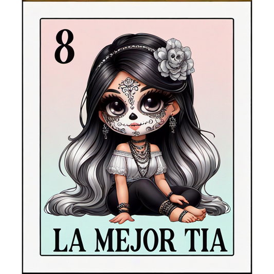 This charming illustration features a cute, stylized character with a sugar skull design, honoring "La Mejor Tía" with intricate details.
