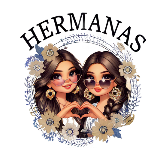 A charming illustration featuring two sisters, adorned with sunglasses and floral accents, with "HERMANAS" elegantly displayed above. dtf prints
