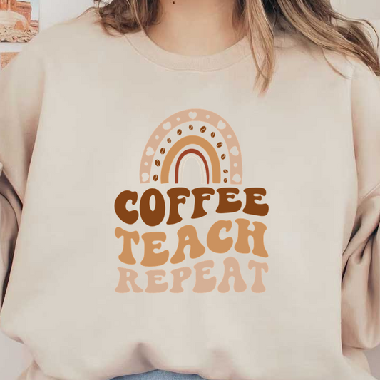 A cheerful design featuring the words "Coffee Teach Repeat" beneath a colorful rainbow, ideal for educators who love coffee! dtf transfers