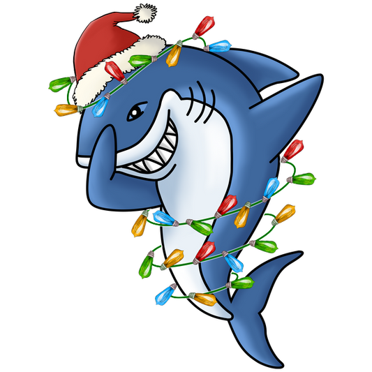 A playful cartoon shark wearing a Santa hat and decorated with colorful Christmas lights, exuding festive cheer. heat press transfers