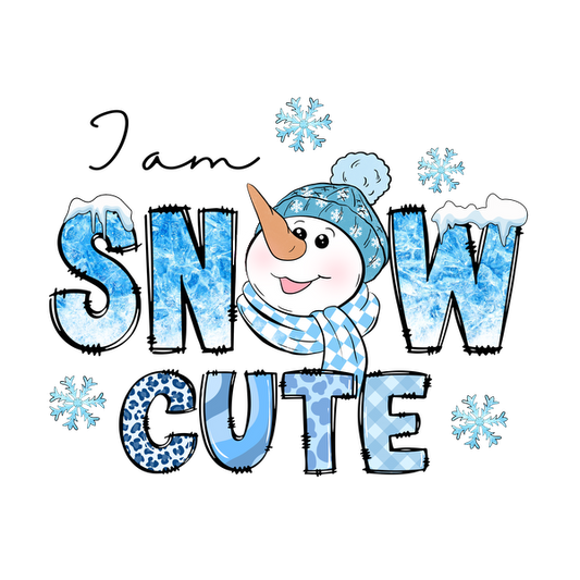 A cheerful snowman with a blue hat and scarf, surrounded by snowflakes, highlights the playful "SNOW CUTE" text. dtf transfers