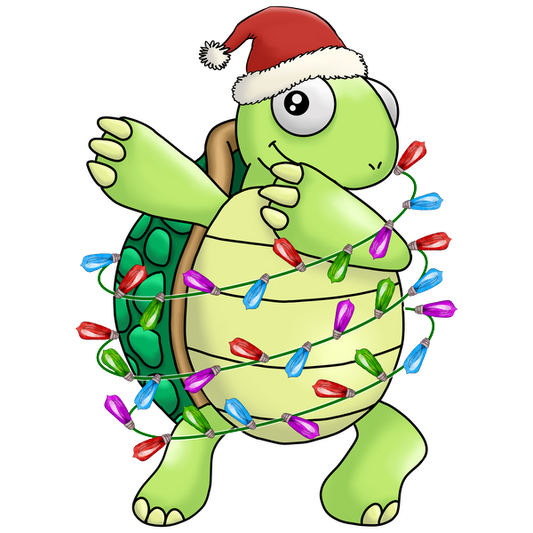 Regular price From £0.75 GBPRegular priceUnit price / per£2.39 GBPSale price From £0.75 GBPA cheerful cartoon turtle wearing a Santa hat and wrapped in colorful holiday lights, ready to celebrate the season! heat press transfers