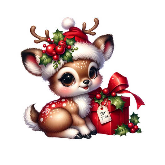 Adorable cartoon reindeer wearing a festive hat and holly, sitting next to a red gift box labeled "for you." dtf prints