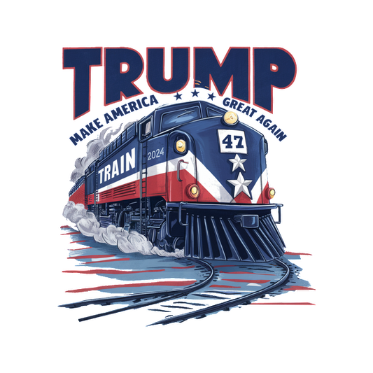 A vibrant graphic featuring a vintage train adorned with "TRUMP" and "TRAIN 2024," symbolizing a political campaign theme. heat press transfers