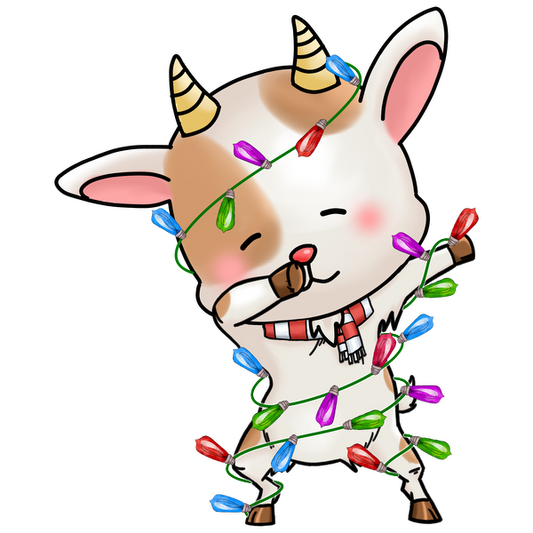 Regular price From £0.75 GBPRegular priceUnit price / per£2.39 GBPSale price From £0.75 GBPA cute cartoon goat playfully wrapped in colorful Christmas lights, wearing a striped scarf and sporting adorable horns. heat press transfers