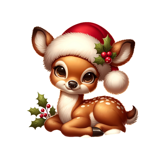 A cute, cartoon-style fawn wearing a festive Santa hat, adorned with holly and berries, exuding holiday cheer. dtf transfers