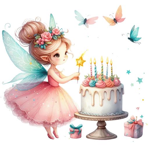 A charming fairy in a pink dress decorates a colorful birthday cake with flowers and candles, surrounded by butterflies and gifts.DTF Transfers