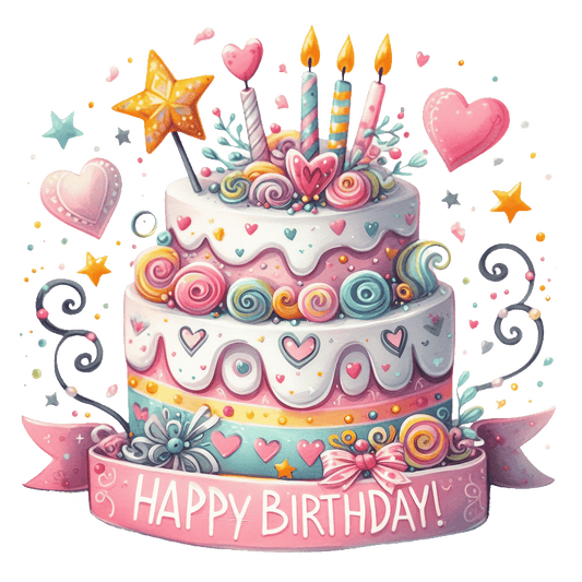 Regular price From £0.75 GBPRegular priceUnit price / per£2.39 GBPSale price From £0.75 GBPCelebrate with this colorful three-tier birthday cake adorned with vibrant swirls, candles, and a cheerful "Happy Birthday!" banner.DTF Transfers
